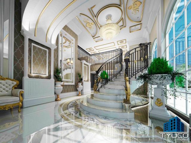 O Hall principal abre as portas para seu novo lar com a perfeição da arquitetura neoclássica, evidenciada com o majestoso pé-direito duplo e sua deslumbrante escadaria, enobrecida por acabamentos em dourado.