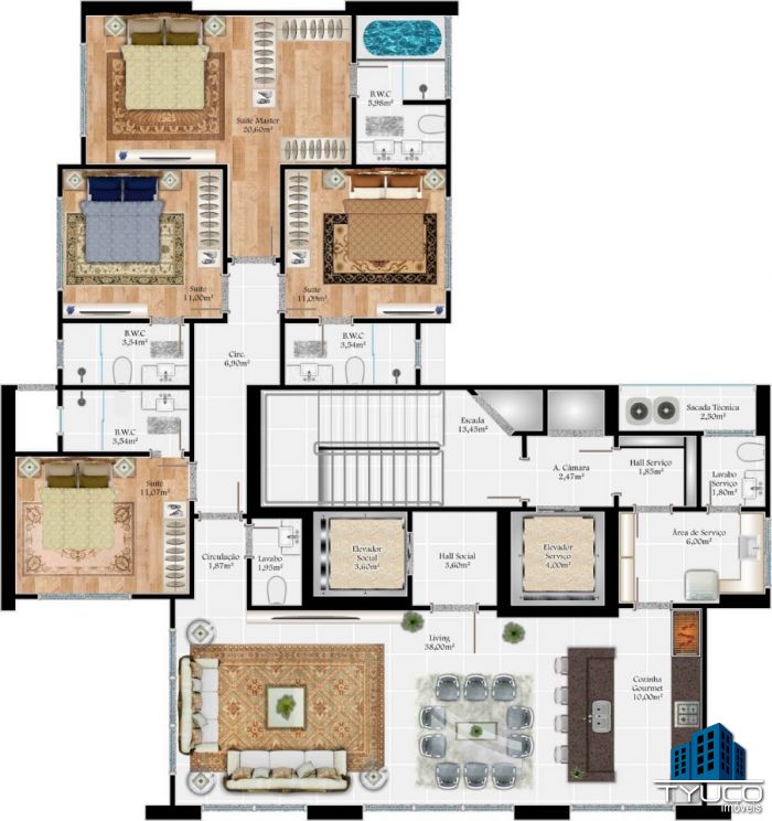 - 04 Suítes, sendo uma máster com mais de 25m²