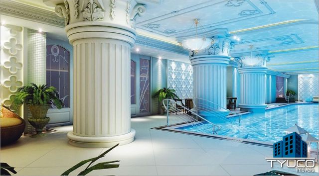 Suntuosas pilastras marcam a área da Piscina Aquecida do empreendimento. Com projeto de iluminação diferenciada, este é o espaço perfeito para relaxar, cercado de toda a força e beleza do verdadeiro neoclássico.