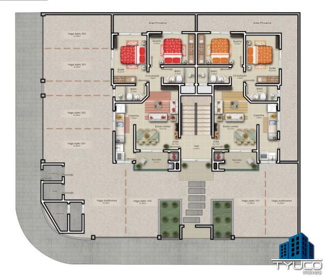 Dois apartamentos por andar.