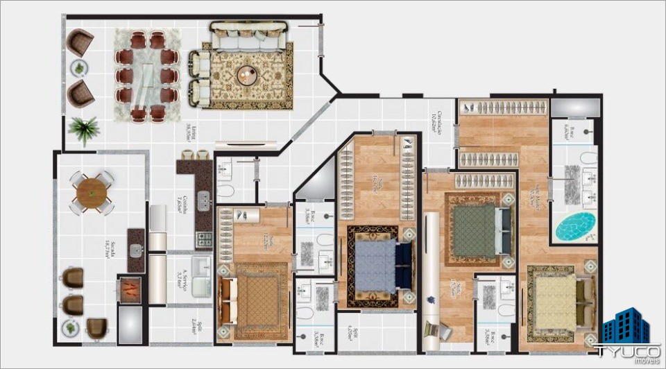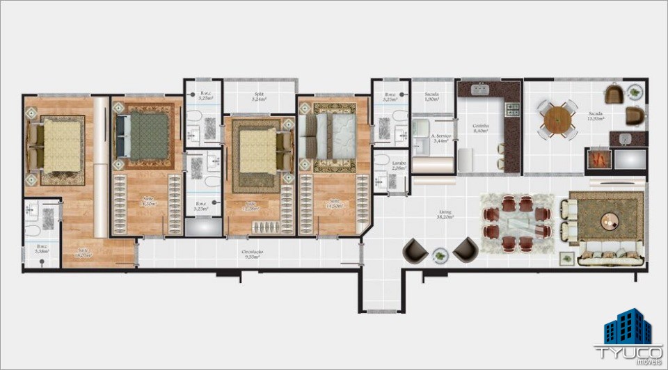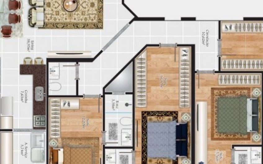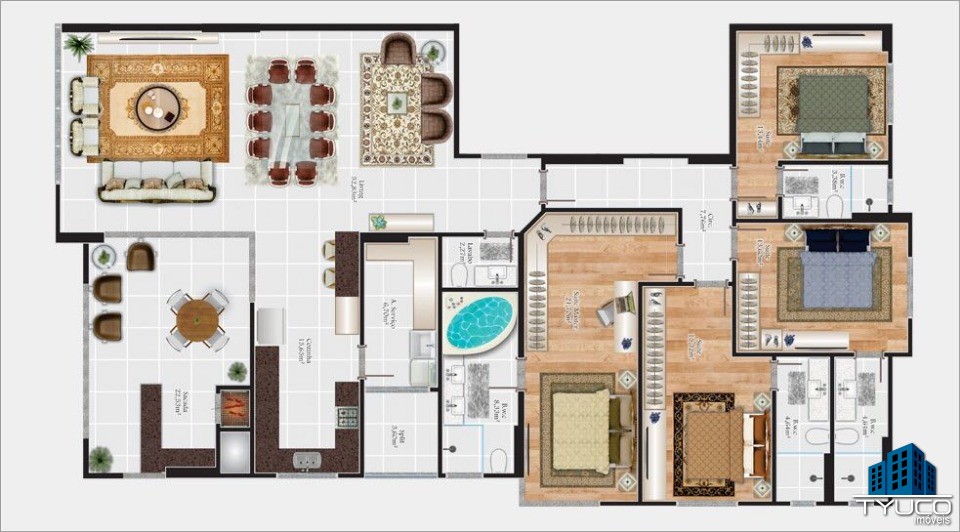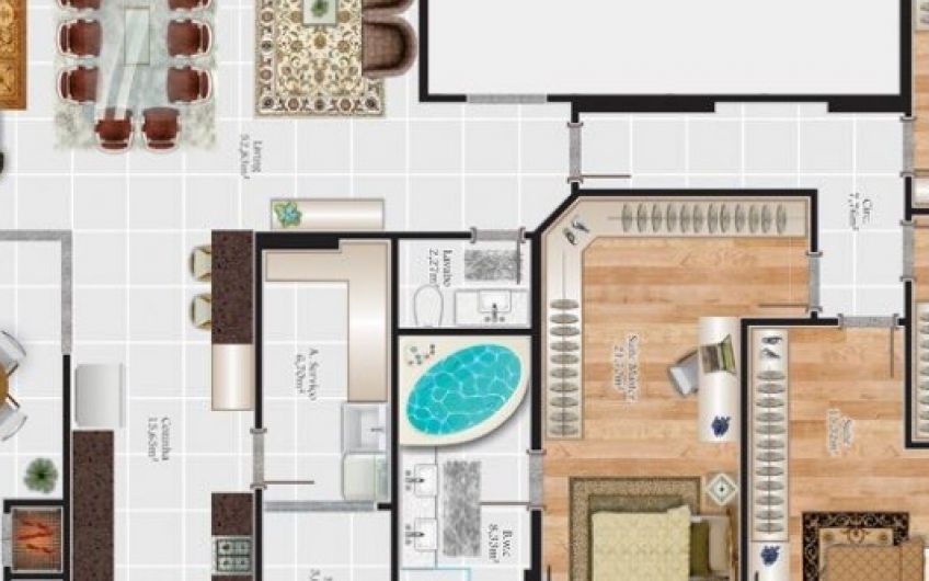 Apto tipo 03 – 290m² (área total aproximada) com 3 vagas de garagem